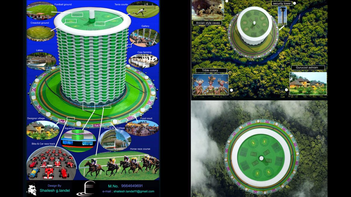 Envisioned as a megastructure rising 1,500 metres into the sky with a 1,000-metre diameter, the Green Global Smart City is designed to accommodate up to 20 lakh people in a four-square-kilometre constructed area, surrounded by an unlimited designer forest. Tandel describes it as a game-changer for the construction and urban development industry.